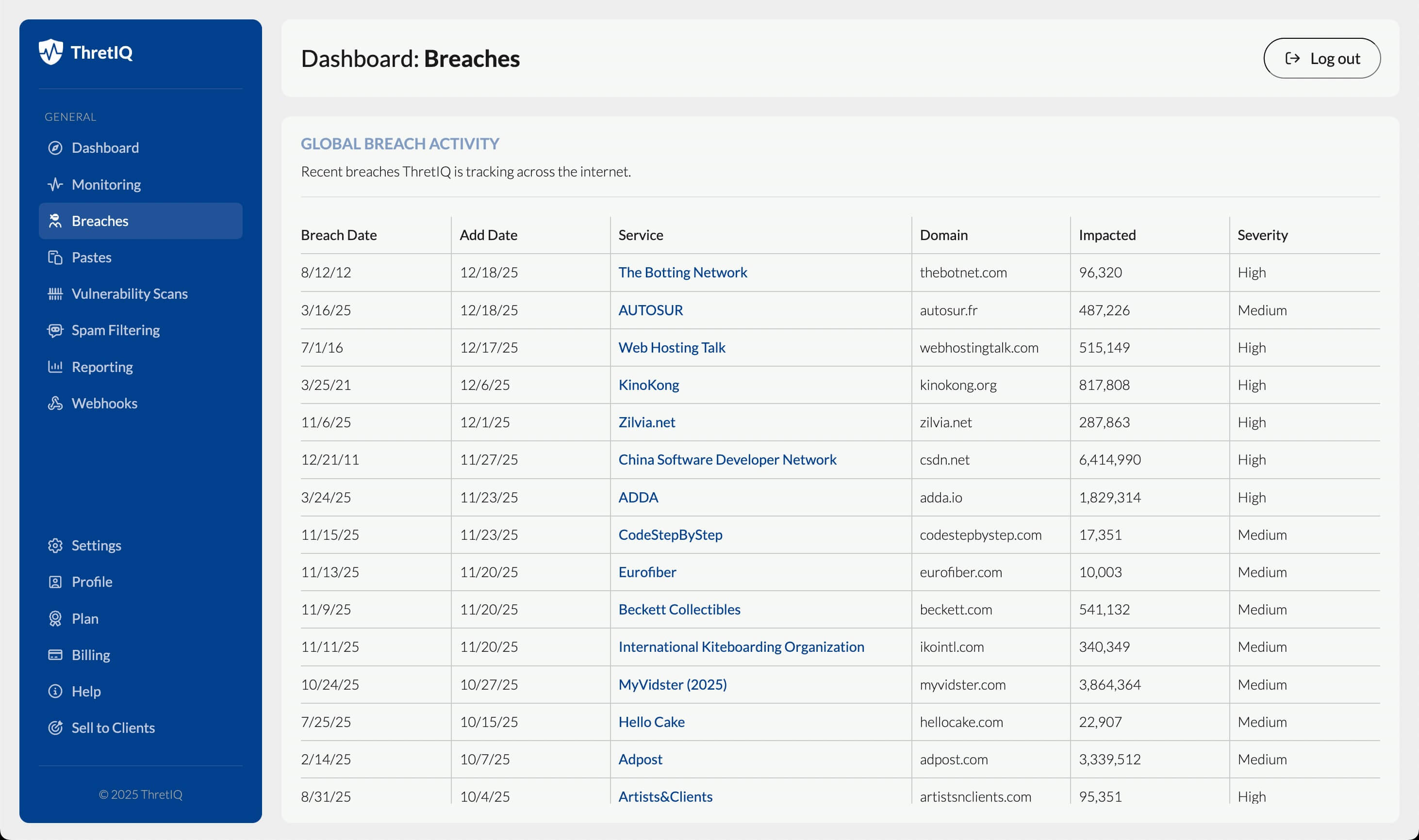 Choose the level of protection that fits your operation - whether you're monitoring a single domain or managing dozens of clients. Every plan includes real-time breach alerts, actionable guidance, and the core intelligence engine that powers ThretIQ.